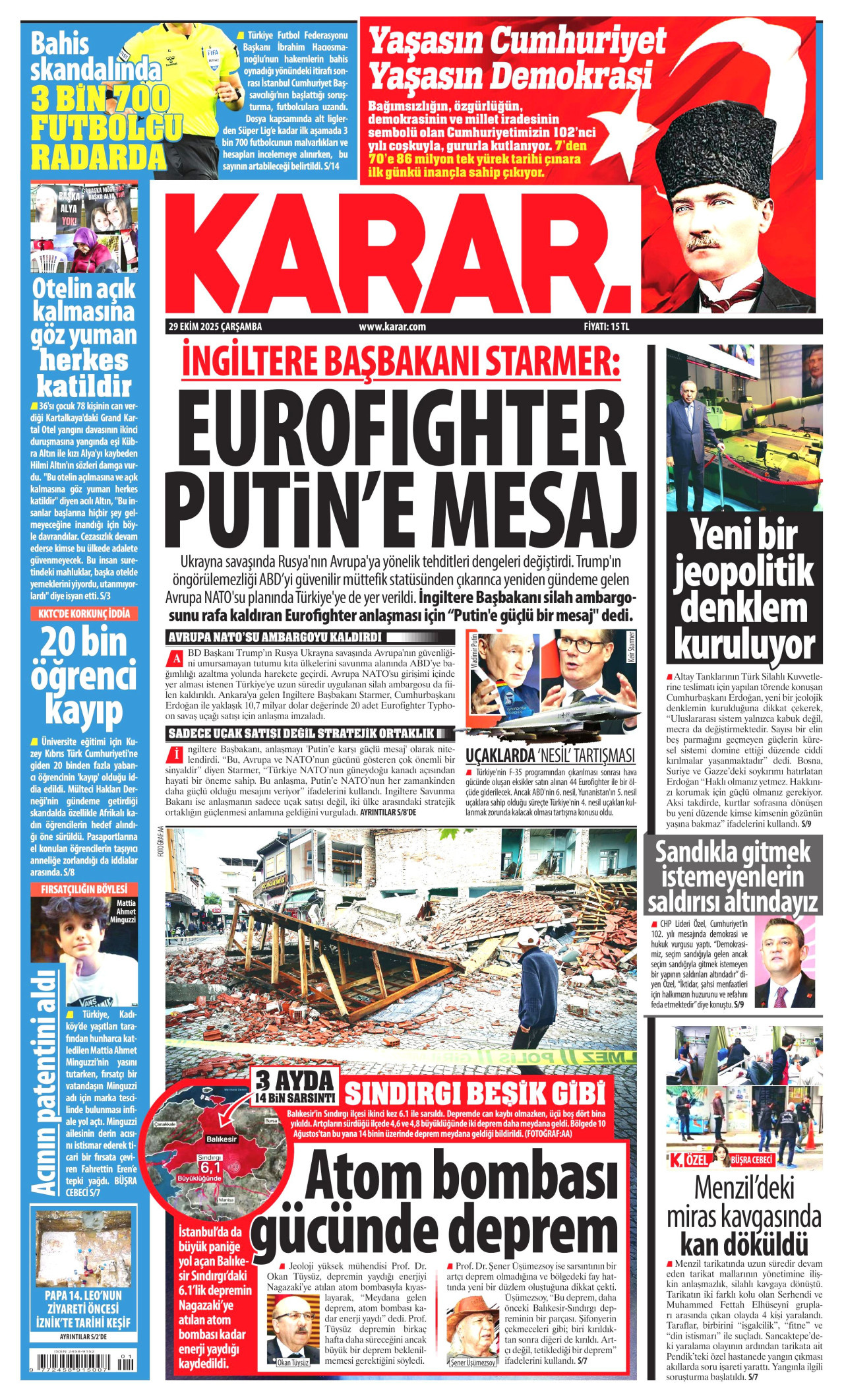 KARAR Gazetesi 28 Ekim 2025, Salı Günü Manşeti